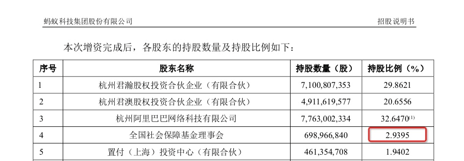 根据蚂蚁招股书显示,蚂蚁前三大股东依次为:员工持股平台、阿里巴巴集团、全国社保基金。也就是说,社保基金是蚂蚁最大的外部股东。