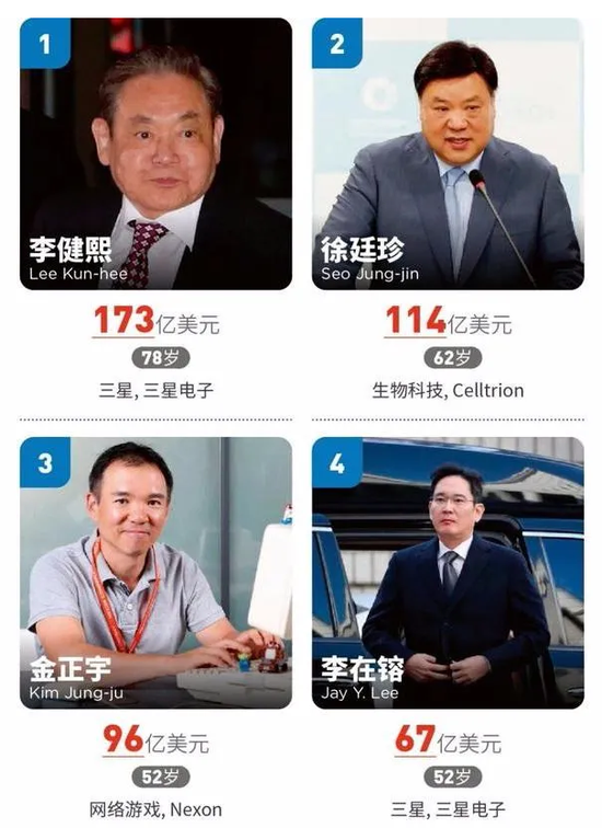 从个人财富来看,据7月9日福布斯发布2020年韩国富豪榜显示,会长李健熙财富居首,达173亿美元(约合1156亿元人民币);其儿子,即三星副会长李在镕财富为67亿美元,位列第四。