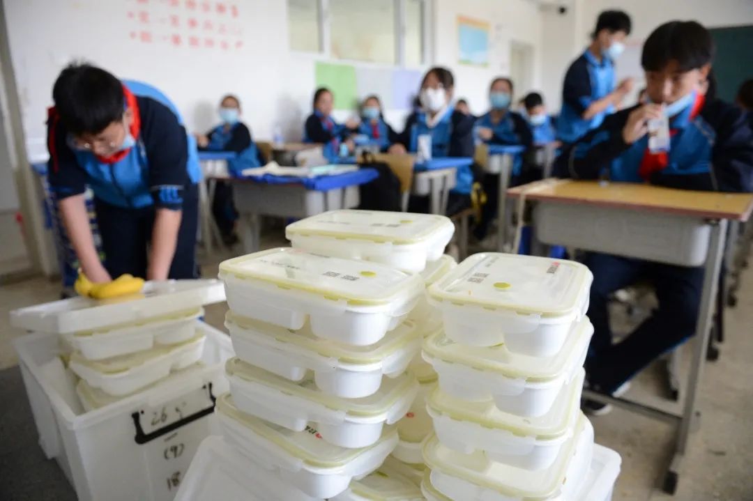 2020年5月11日,学生将配餐餐盒放在一起。当日,呼和浩特40所试点学校全部实行营养餐配送。