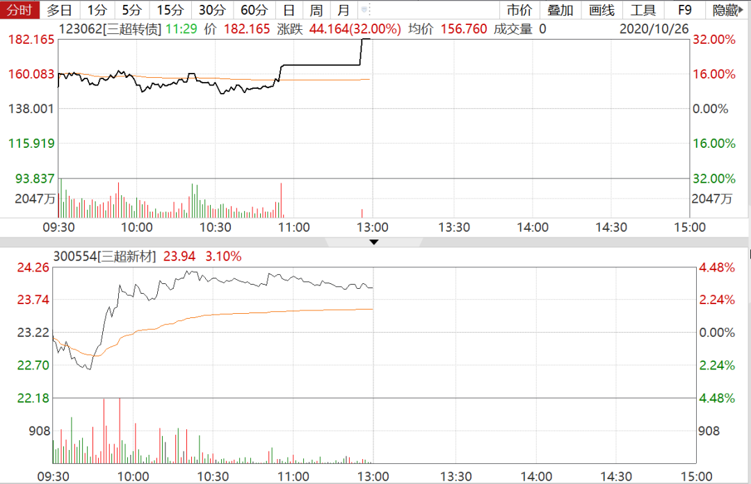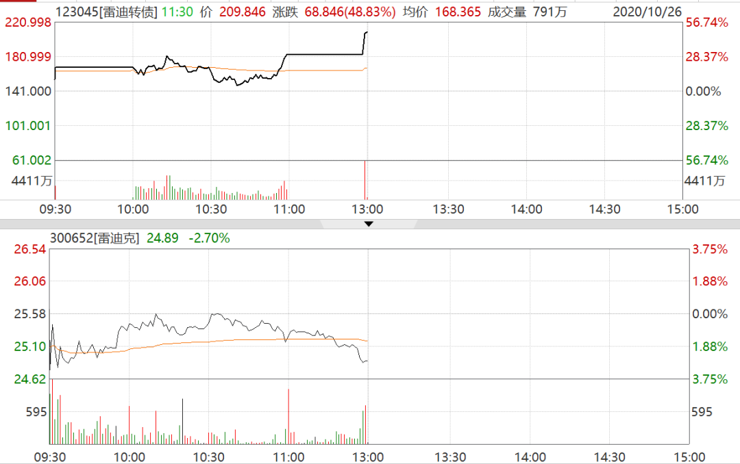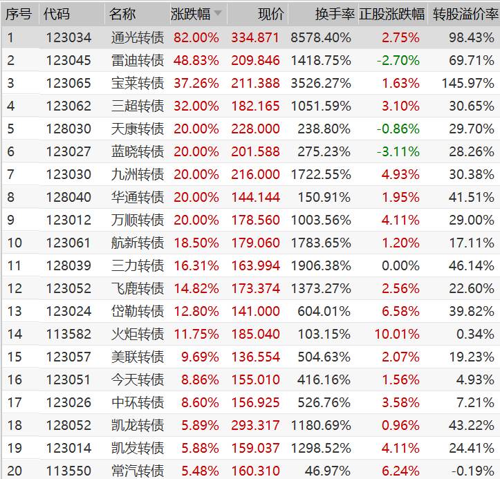 截至上午收盘,通光转债涨82%、雷迪转债涨近49%,共9只转债涨幅在20%及以上。