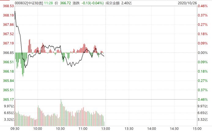 26日上午,中证转债指数走势脱离大盘。沪指低开后逐步修复涨幅,中证转债指数高开低走,盘中上下震荡。