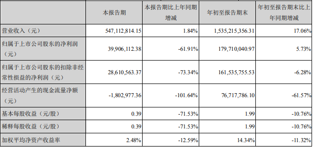 公司近日发布2020年三季度报告,公告显示2020年1-9月实现营收15.35亿元,同比增长17.06%;归属于上市公司股东的净利润1.80亿元,同比增长5.73%,经营活动产生的现金流量净额7671.78万元,同比下降61.57%;其中第三季度归属于上市公司股东的净利润3990.611万元,同比下滑61.91%,经营活动产生的现金流量净额亏损180.30万元,同比下降101.64%。