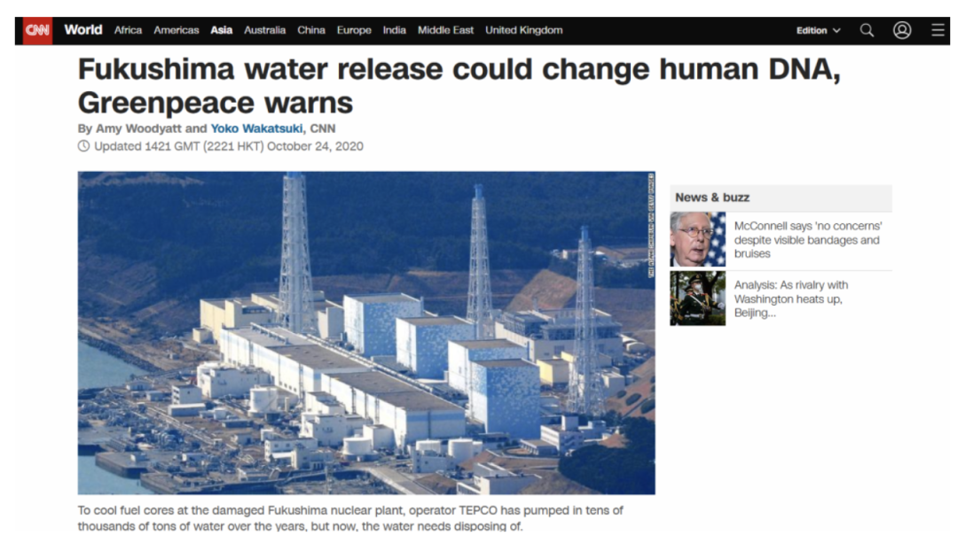 据CNN24日报道,国际绿色和平组织报告称,这些核污水中含有放射性同位素氚和碳-14,其中,碳-14作为“人类集体辐射剂量的主要贡献者,有可能损害人类DNA”。绿色和平组织高级核专家肖恩·伯尼(ShaunBurnie)称,存储水箱中总共可能有多达63.6GBq(千兆贝克勒尔)的碳-14。“这些及污水中的其他放射性核素,在数千年内都将是危险的,并有可能造成基因损害。这也是必须放弃这一计划(排放入海)的原因。”