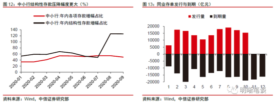 结构性存款压降导致部分中小银行出现负债缺口。从央行公布的信贷收支表数据来看,截止9月末结构性存款总量8.98万亿元,低于2020年年初;如果考虑到年末压降要求,各类银行至年底或仍然需压降2.58万亿元结构性存款。如果我们不考虑结构性存款向国库库款以及M0的转化,结构性存款压降将不会影响准备金总量而只会影响准备金结构。从7月后各类型银行结构性存款压降的规模来看,当前结构性存款压降额更多的由中小行完成(例如9月大型银行结构性存款总量上行1156亿元,而中小型银行则压降5627亿元)。由于中小行结存压降规模更大,7月至今中小行准备金总额占比已经下降了约1%。结构性的负债缺口更多的抬升了部分银行NCD的融资价格,这一点尤以股份行NCD价格的上行更明显。预计银行负债稳定性的下降或推升资金面的波动程度。
