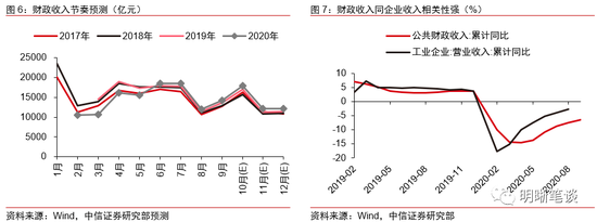 11月是历年的财政收入低点,预计缴税压力较小。从过去三年财政收入的节奏上看,11月历年来是财政收入的低点。过去三年中,下半年财政收入节奏的一致性和确定性非常强,因此我们可以先估计四季度的总财政收入,减去已公布月份的收入,再按照过去三年的平均比例分配给四季度每个月份,来估计11月的财政收入。财政部分绝大部分来源于税收收入,而税收收入与名义GDP的相关性较强,财政收入可以大致根据名义GDP的预测(四季度名义GDP预测增速大约为7.5%)进行估计。税收收入部分,8、9月份的税收同比增速已经恢复至7%和8.17%,超过了名义GDP增速;非税收入部分,随着降费措施的迫切性下降,非税收入降幅明显收窄,8、9月份同比分别-1.45%和-4.95%,但仍然对财政收入形成一定拖累。两者加总来看,财政收入8月和9月同比为5.3%和4.5%,低于税收收入的增速。由于税收收入在公共财政收入中的占比往往在80%以上,综合考虑预测四季度财政收入增速大致为5.5%,参照往年财政收入结节性因素,我们估计11月财政收入在12000亿元左右,预计国库库款收缴的压力相对较小。