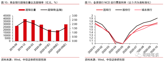 银行间超储规模维持紧平衡状态,预计11月资金面仍然易受扰动。从商业银行准备金池总规模来说,目前银行间流动性总量仍处于紧平衡。我们测算的9月末商业银行超储率大致在1.6%左右的水平。从静态推算的角度出发,截止目前10月月内央行共计回收了4500亿元流动性,财政净融资全月预计在7000亿元左右,综合考虑后10月末超储率或徘徊在1.15-1.25%左右的水平,仍然处于较低的“水位”区间。结构性存款压降导致部分中小银行出现负债缺口。7月结构性存款压降额更多的由中小行完成。7月至今中小行准备金总额占比已经下降了约1%。结构性的负债缺口更多的抬升了部分银行NCD的融资价格,尤以股份行NCD价格的上行更明显。预计银行负债稳定性的下降或推升资金面的波动程度。
