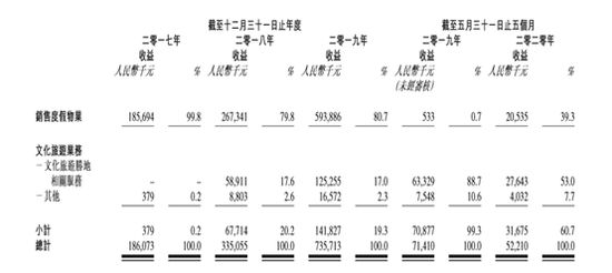 分业务来看,中国文旅的收益主要来自销售度假物业,文化旅游板块对收益的贡献较小。根据招股书,2017-2019年度,公司来自销售度假物业的收益分别为1.86亿元、2.67亿元及5.94亿元,分别占总收入的99.8%、79.8%及80.7%,而来自文化旅游业务的收益仅占总收入的0.2%、20.2%、19.3%。