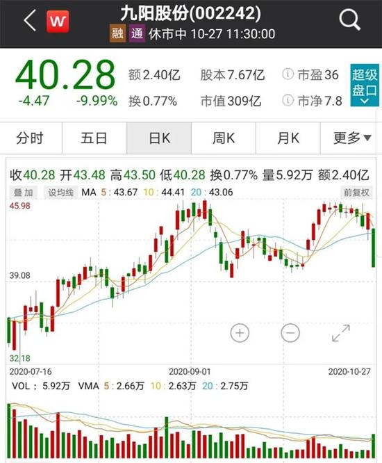 小家电龙头九阳股份今日早盘股价低开低走,开盘后10分钟便触及跌停,截至午盘跌停板封单留有6063手。在此之前,九阳股份今年年内累计涨幅超过80%。