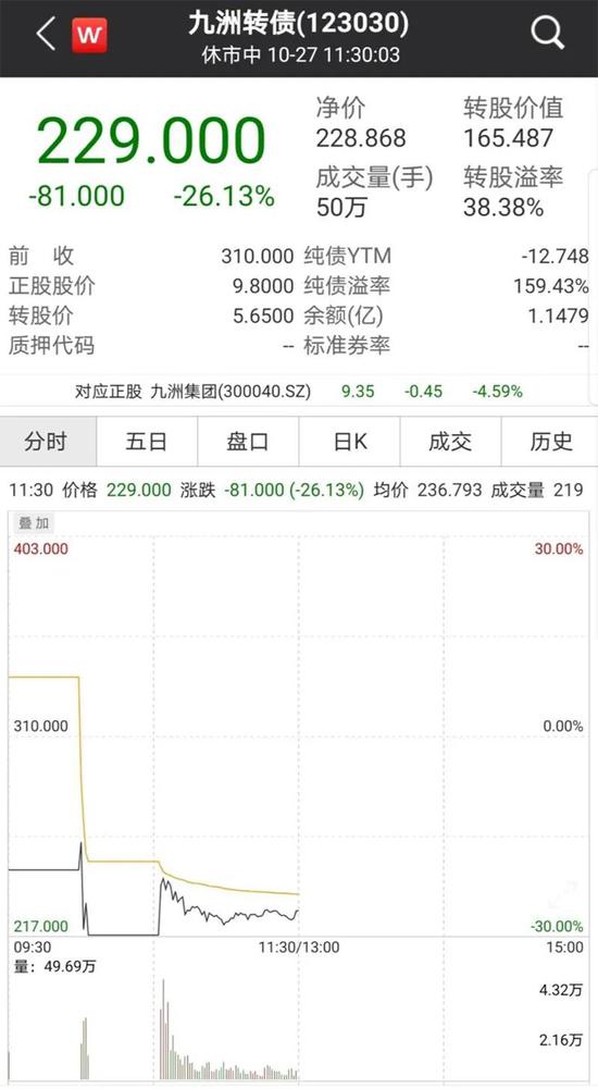 截至午间收盘,九洲转债报229元,下跌26.13%,对应正股九洲集团下跌4.59%。