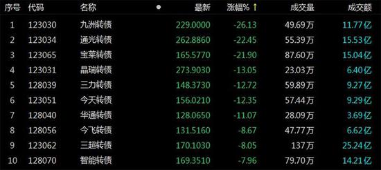 除了九洲转债外,通光转债、宝莱转债、晶瑞转债等今日早盘跌幅均超过10%。