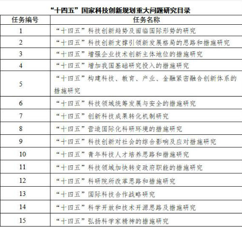 经济观察网梳理,十五个重大问题中五个由两个研究单位承担,包括“科技创新支撑引领新发展格局的思路和措施研究”、“科技、教育、产业、金融紧密融合创新体系的措施研究”、“科技成果转化机制研究”、“青年科技人才培养思路和措施研究”“弘扬科学家精神的措施研究”,对比《“十三五”国家科技创新规划》,“弘扬科学家精神”将第一次出现在新五年规划中。