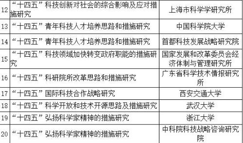 今年9月28日,科技部就15个国家科技创新规划重大问题面向社会征集研究单位,截至10月15日共收到241份课题申请书,经专家评审,面向15个研究方向遴选了20个任务承担单位参与“十四五”国家科技创新规划研究。