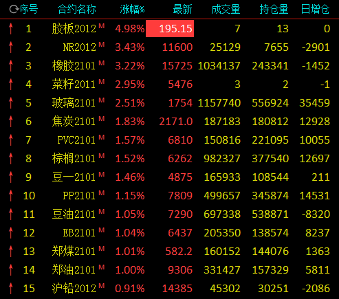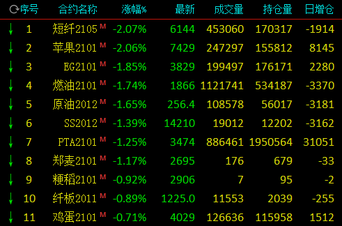 热点栏目10月27日,国内期市收盘涨跌互现,20号胶、橡胶涨逾3%,能化品分化,PVC、PP涨逾1%,短纤跌逾2%,乙二醇、燃油、原油跌近2%;黑色系飘红,玻璃涨逾2%,焦炭涨近2%;油脂走升,棕榈油、豆油涨逾1%,其他农产品中,苹果跌逾2%。
