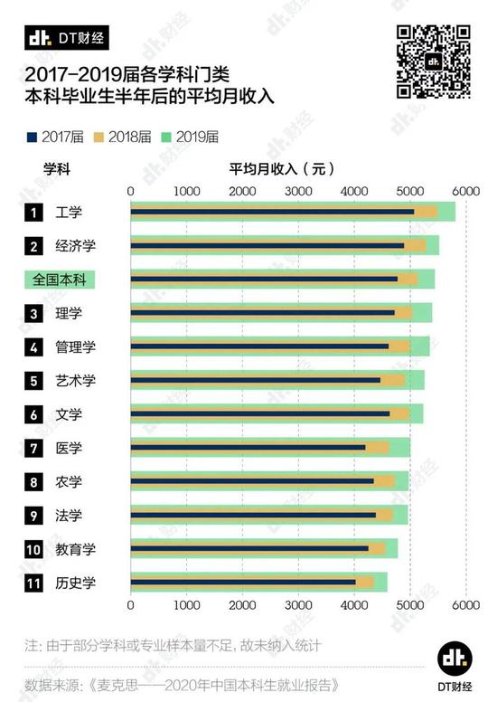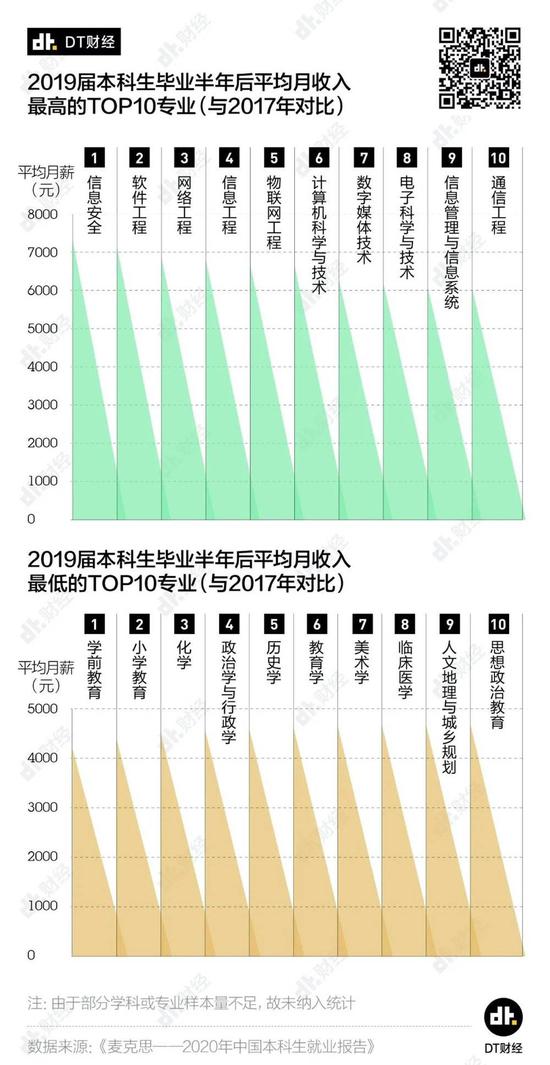 收入排名倒数的前10个专业中,有8个都是文科专业。以学前教育和小学教育为例,这两个专业的毕业生,毕业半年后的平均月收入分别只有4201元和4380元。此外,历史、政治等就业率低的专业,收入也同样倒数。