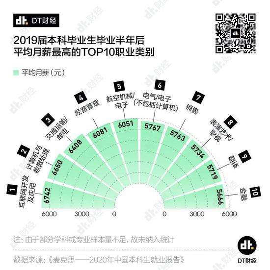 从整体来看,因为2019届本科毕业生毕业半年后月收入最高的TOP5职业类别中,有2个与互联网相关的,分别是排名第1的互联网开发及应用和第2的计算机与数据处理。毕业后从业于这两个职业类别的本科应届毕业生,入职半年后的平均月收入分别为6742元和6650元。