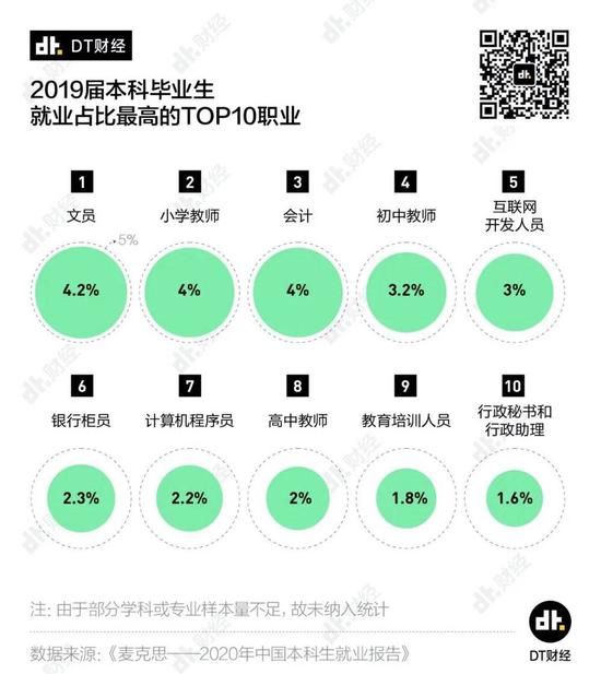 不过,大行业的整体繁荣并不代表所有细分职业都得到了肯定,毕业生们在择业时也会选择更适合自己的职业。当我们从整体行业渗透到细分职位时,找到了吸收了2019年应届本届毕业生最多的职业。排在前5位的分别是文员、小学教师、会计、初中教师、互联网开发人员。