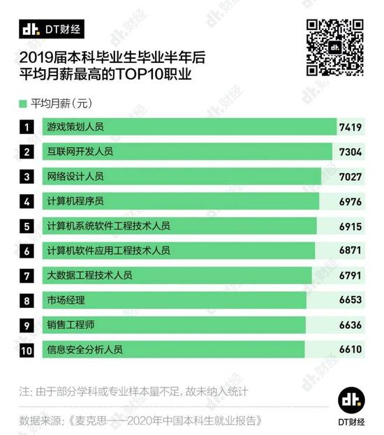 从细分职业来看,在2019届本科毕业生毕业半年后,月收入最高的TOP5职业全都与互联网相关。就算放大到TOP10职业,其中也有8个互联网相关的职业。