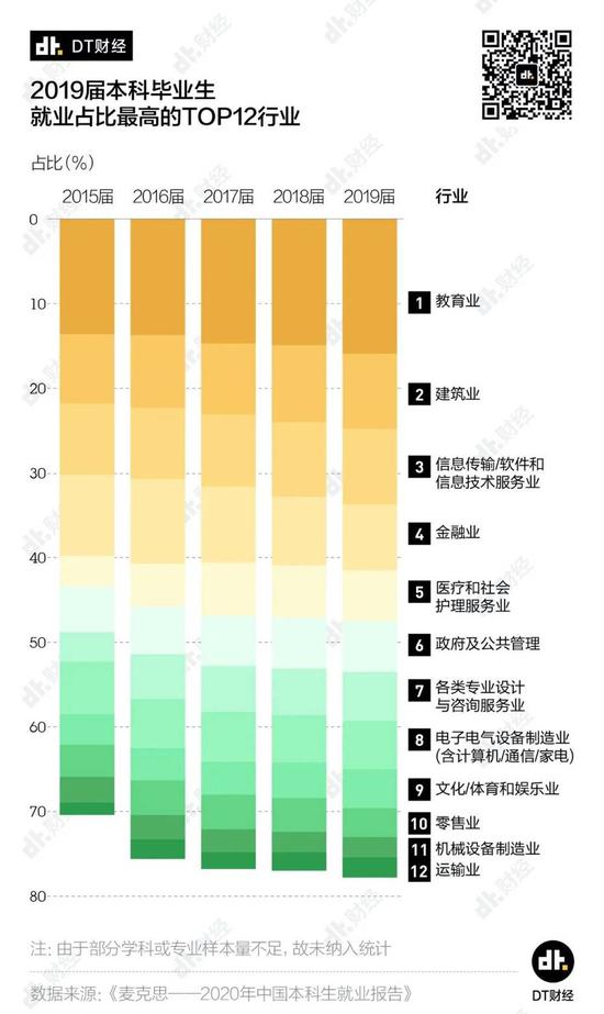 从2019年的数据来看,教育业、建筑业、信息传输软件和信息技术服务业,这三大行业总共吸收了33.7%的本科应届毕业生,是本科应届毕业生心中的“吉祥三宝”。