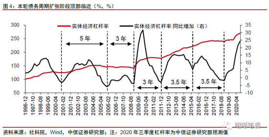 10月21日易纲行长在2020年金融街论坛上提出,“保持货币供应与反映潜在产出的名义国内生产总值增速基本匹配”。这句话在一定程度上给予了市场预测明年社融增速的锚。根据我们测算,明年社融增速可能会落在11%-12%的区间,明年的宏观杠杆率会非常平稳,以宏观杠杆率的同比增量作为判断指标的债务周期或将在四季度见顶。
