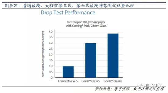 在智能手机领域,提升玻壳的防护能力主要包括两方面:抗摔落能力和抗划伤能力,从图表14中可以看出,从第三代大猩猩玻璃到第六代,弹性模数不断提升,玻璃的抗摔落能力不断增强,第四代大猩猩玻璃跌落后80%几率完好无损的高度约为1米,第五代和第六代分别提升至1.2米和1.6米。