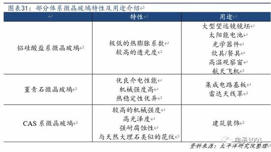 正是凭借其种类的多样性和优异的产品性能,微晶玻璃在高新技术领域有广泛的应用,举例而言,以铝硅酸盐系玻璃为原材料,析出β-石英固溶体晶相的微晶玻璃,兼具极低的热膨胀系数和较高的透光度,已被应用于大型望远镜镜坯、太阳能电池、光学器件、炊具/餐具、高温观察窗和太空机器人、航天飞机、宇宙飞船、卫星等航空航天设备领域;具备优良介电性能、机械强度和热稳定性的堇青石微晶玻璃已应用于集成电路基板、雷达天线罩等领域;CAS系微晶玻璃凭借其较高的机械强度、高光泽度、强耐腐蚀性以及与天然大理石类似的花纹等特点,常在建筑装饰领域替代天然石材。