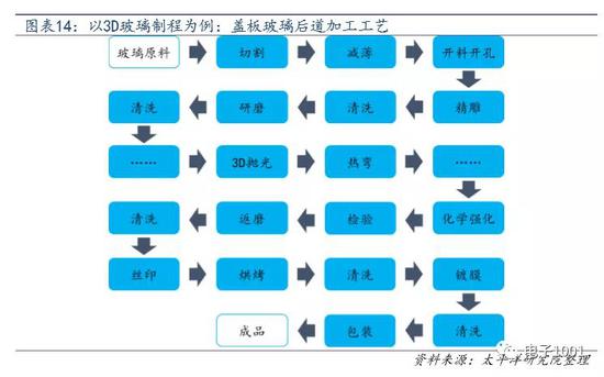 2.后道:发展至今,生产一片高端的智能手机视窗防护玻璃或者玻璃背板需要经历数百道甚至上千到后道加工工艺流程,由于玻璃的应力所带来的形变的回弹等原因,部分工艺流程还需要反复多次进行,以期达到最为精确与稳定的状态。具备代表性的玻璃盖板的后道加工工艺包括包括切割和减薄、CNC雕刻、研磨、强化、丝印、镀膜和清洗:(1)切割和减薄是将原板尺寸白片玻璃切割成比成品尺寸略大的玻璃,并减薄至合适的厚度;(2)CNC雕刻主要为了实现打孔、雕槽和磨边等;(3)研磨的目的是减薄玻璃的厚度并增加平整度;(4)强化是使用离子交换原理,增强玻璃的表面应力;(5)丝印主要是为了在玻璃表面形成颜色与图案,增强外观效果;(6)镀膜的目的包括两类,一类是镀AR膜、AF膜,加强玻璃的抗指纹、抗反射、抗眩光能力,另一类则是与丝印类似,形成渐变色或带光学纹路的效果,可以更好地增强视觉效果。如果需要实现3D等曲面外形效果,还需要增加热弯和3D抛光等工艺。