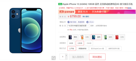 此外,证券时报·e 公司记者10月29日从京东Apple产品京东自营旗舰店看到,该店iPhone 12普遍处于缺货状态,除黑色、红色64G有现货可以直接官网价格购买外,其他白色、蓝色、绿色各版本以及黑色、红色128G、256G版本都处于缺货状态,需等待到货通知。天猫苹果官方旗舰店则显示,iPhone12现在下单,12天内发货。
