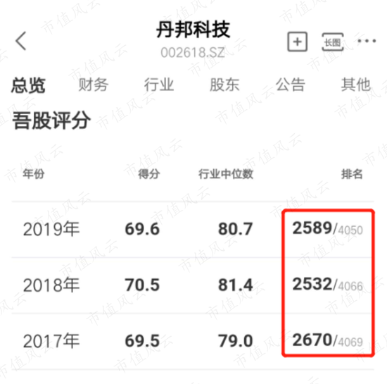 最近三年,丹邦科技在吾股系统中的排名都在2500名以后,是实打实的A股差生。
