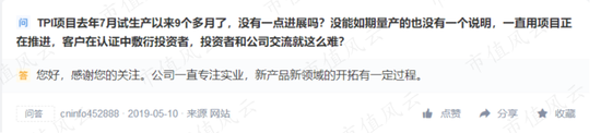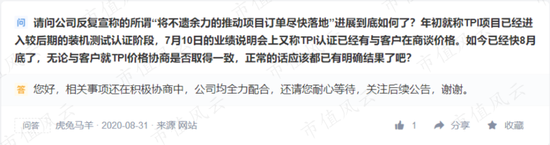 面对投资者对TPI膜项目进展缓慢的多次追问,丹邦科技的回答总离不开“全力推动项目进度”,没有针对确切的认证期限进行正面回复,还总以“拖字诀”拒绝投资者提出的调研要求。