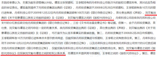 在此次终审判决文书中,明显出现了刘萍侄子刘文魁为谭芸代持丹侬科技的字眼,而相关证据已被法院证实。