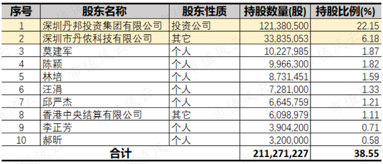 截至2020年7月末,控股股东深圳丹邦投资集团有限公司(以下简称“丹邦集团”)持股22.15%,公司早期员工持股平台深圳市丹侬科技有限公司(以下简称“丹侬科技”)系第二大股东。
