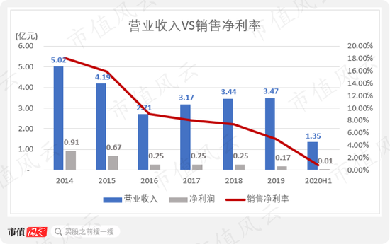 公司的销售净利率也一路下滑,2020年上半年丹邦科技销售净利率只有1.35%,堪称微利。