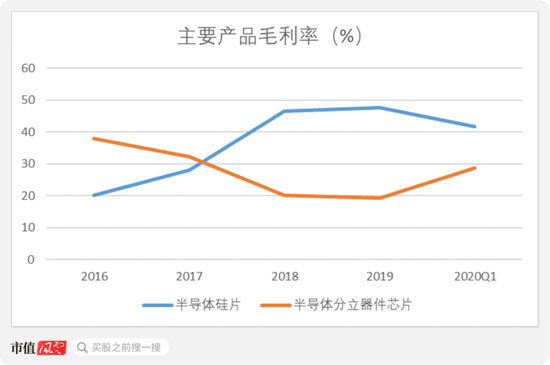 另外,风云君发现,2016年-2020年3月期间,立昂微两大主营业务的毛利率变动趋势存在明显的反差;半导体硅片业务的毛利率明显上升,而半导体分立器件芯片业务的毛利率却明显下滑。