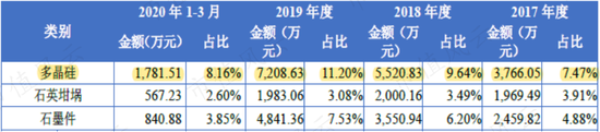2017年-2020年3月,立昂微对外采购的原材料中,多晶硅的采购金额在所有原材料中占比最高。