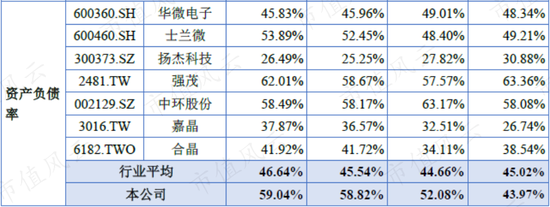 还是以2019年为例,七家可比公司的平均资产负债率水平为45.54%,而立昂微为58.85%,依然居于最高位。