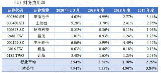 除了毛利率水平,立昂微的销售费用率、管理费用率、研发费用率等也都优于上面几家可比公司,唯独财务费用率不同。