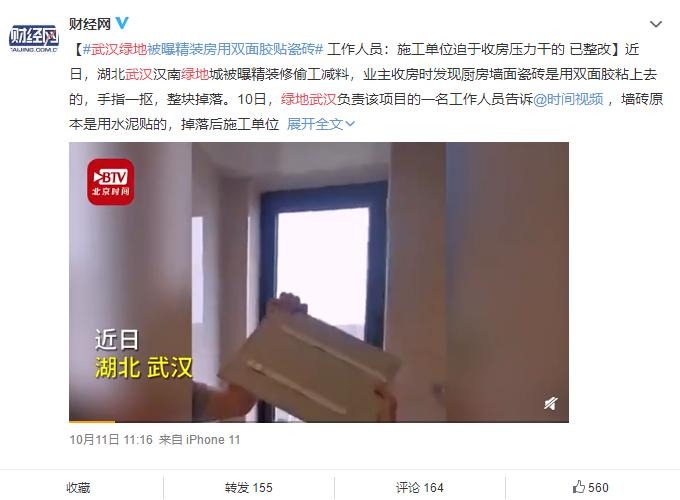 国庆过后,有武汉汉南绿地城业主反映,收房时发现瓷砖是用双面胶贴上去的,手指一抠,整块掉落。