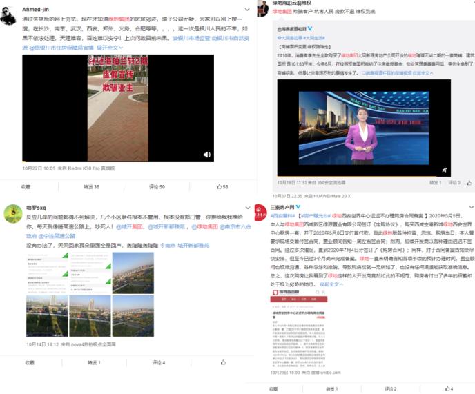 如今,微博中关于绿地集团仍有来自银川、大同、西安等多地业主的控诉,而在黑猫投诉平台中,涉及绿地集团的43条投诉的投诉时间均分布在近两年,更有31条是在今年发出的,投诉内容多为虚假宣传、延期交房、无法退款等。