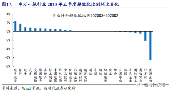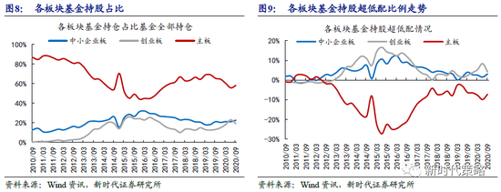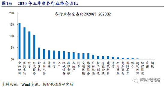 三季度公募基金各板块持仓占比主板、中小板上升,创业板下降。以A股各板块自由流通市值的占比为基准,三季度公募基金持仓超配中小创,低配主板。以上述主动型权益基金重仓股为样本,截至2020年三季度公募基金对主板、创业板和中小板的持股占比分别为58.12%、19.19 %和22.69%,与2020年二季度相比主板和中小板分别提升2.42和1.47个百分点,创业板下降3.89个百分点。以各板块自由流通市值占比为参考,公募基金分别超配中小板、创业板3.09和4.10个百分点,低配主板7.19个百分点,环比来看2020Q3中小板超配比例提升1.55个百分点,创业板超配比例回落4.26个百分点,主板低配比例2.71提升个百分点。