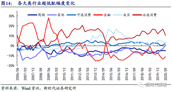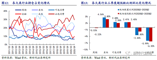 公募基金三季度开始大幅减仓必选消费和成长,小幅减仓周期,加仓可选消费和金融。分大类板块来看,三季度公募基金在必选消费、可选消费、成长、金融、周期及其他的持股市值占比依次为29.42%、9.85%、22.48%、9.81%、6.46%和22.25%,与2020年二季度相比,环比变化依次为-5.99、2.48、-3.44、2.41、-0.03和4.56个百分点,大幅减配必选消费、成长板块,增配可选消费和金融板块。相比各板块自由流通市值占比,三季度公募基金仍大幅超配必选消费、可选消费和成长板块,低配周期和金融板块。其中,必选消费、可选消费和成长板块的超配比例分别为10.42%、2.63%、2.06%,金融、周期低配比例分别为10.99%和4.96%。相比2020年二季度,必选消费超配比例大幅减少6.30个百分点,可选消费超配比例提升2.06个百分点,成长超配比例回落1.80个百分点,周期低配比例扩大0.22个百分点,金融低配比例缩小2.45个百分点。