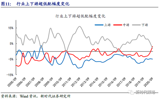 公募基金三季度减仓下游行业,加仓中游。三季度公募基金持仓市值占比中上、中、下游持仓占比依次为6.46%、18.89%和74.65%,环比二季度分别下降0.03、上升5.44和下降5.41个百分点。上、中、下游超低配比例依次为-4.96%、3.21%和1.75%,相比二季度上游低配比例下降0.22个百分点,中游低配比例回升3.72个百分点,下游超配比例回落3.50个百分点。