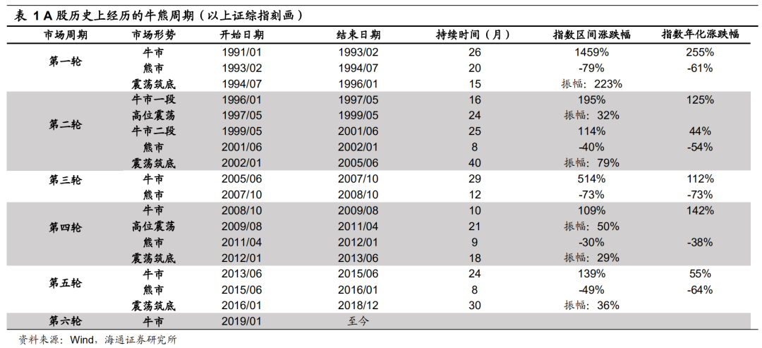 海通证券认为,牛熊周期视角下,即便牛市向熊市转换,四季度也很难大跌。1991年以来A股已经经历了五轮“牛市-熊市-震荡市”周期不断交替的过程。自2019年1月A股开启新一轮牛市开始,目前市场处在第六轮牛熊周期中牛市的上涨阶段。