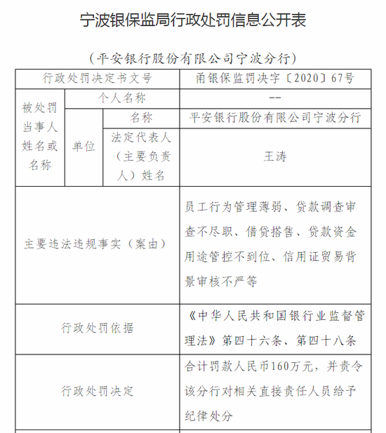 平安银行宁波分行因“员工行为管理薄弱、贷款调查审查不尽职、借贷搭售、贷款资金用途管控不到位、信用证贸易背景审核不严”等,合计被罚款160万元。