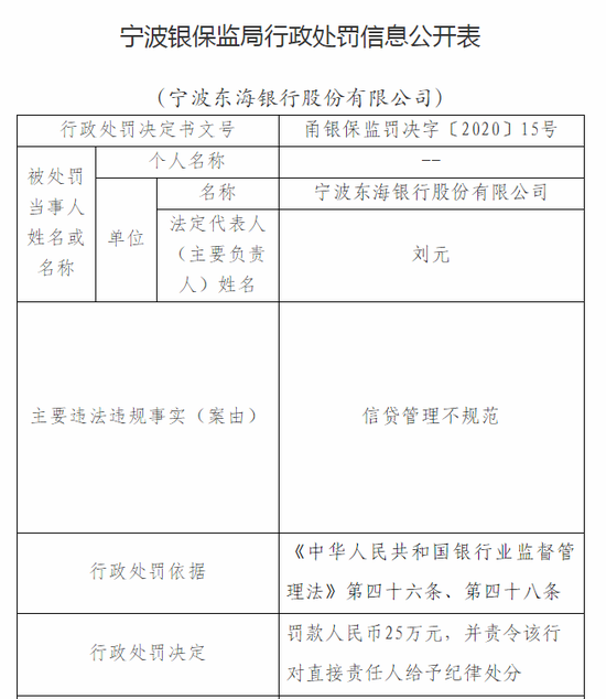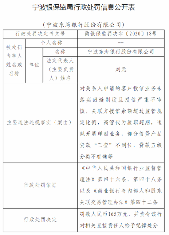 宁波东海银行因“对关系人申请的客户授信业务未落实回避制度且授信严重不审慎,关联方授信余额超过监管规定比例,高管代为履职超期,违规开展理财业务,部分信贷产品贷款‘三查’不到位,贷款五级分类不准确”等,被罚款165万元;因“信贷管理不规范”,被罚款25万元。