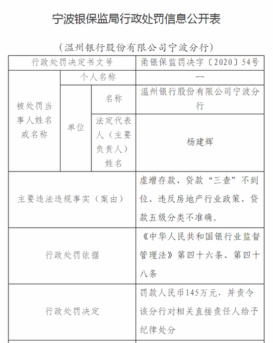 温州银行宁波分行因“贷款‘三查’不到位、违反房地产行业政策、贷款五级分类不准确”,被罚款145万元。