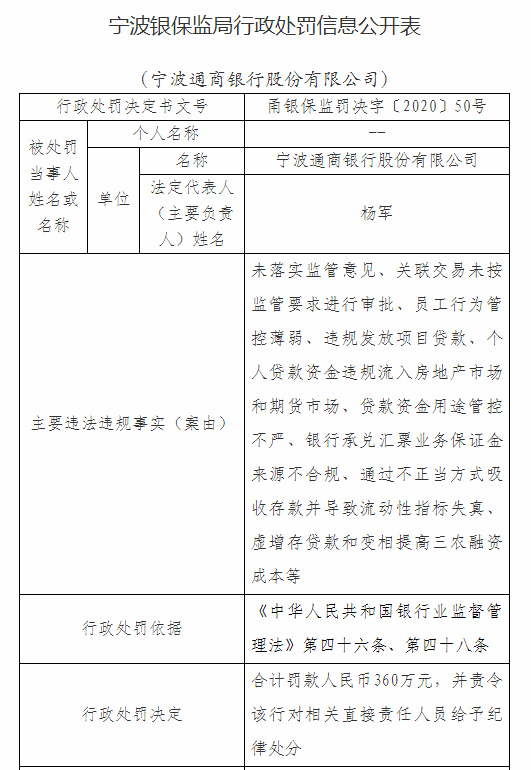 具体来看,宁波通商银行存在“未落实监管意见、关联交易未按监管要求进行审批、员工行为管控薄弱、违规发放项目贷款、个人贷款资金违规流入房地产市场和期货市场、贷款资金用途管控不严、银行承兑汇票业务保证金来源不合规、通过不正当方式吸收存款并导致流动性指标失真、虚增存贷款和变相提高三农融资成本”等多项违法违规事实,被罚款360万元。
