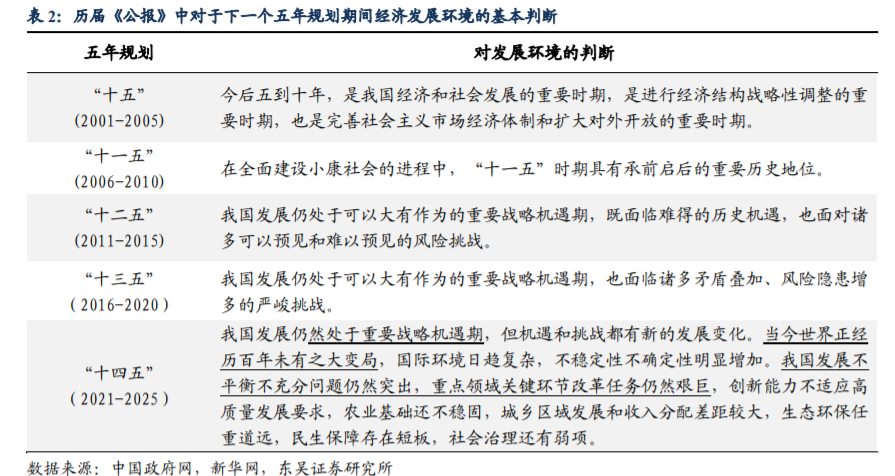 对发展环境的判断发生重大变化。“十二五”以来,对发展环境的基本判断是“我国处于可以大有作为的重要战略机遇期”。虽然此次会议认为我国“十四五”期间仍然处于重要战略机遇期,但对内外部环境的风险和挑战都进行了明确的表述:①海外方面,世界经历“百年未有之大变局”,国际环境不稳定性不确定性明显增加;②国内方面,重点领域关键环节改革任务艰巨,创新能力不适应高质量发展要求等。