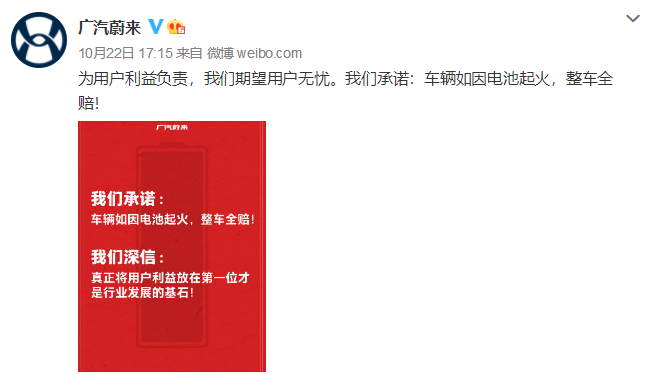 其实,在威马北京事故发生之前,在包括威马汽车等新能源车近期频发“起火”事故的大背景下,10月21日晚上,广汽蔚来CEO廖兵在微博上发布了一张更像是“战书”的承诺书: