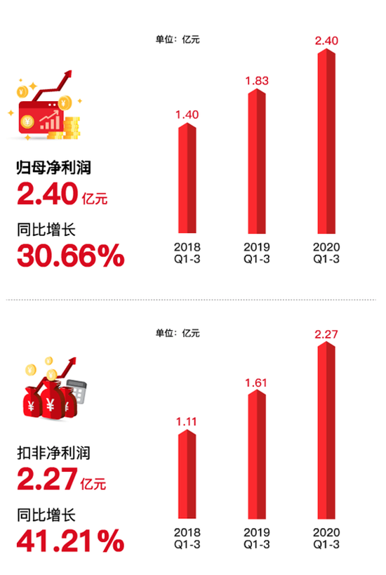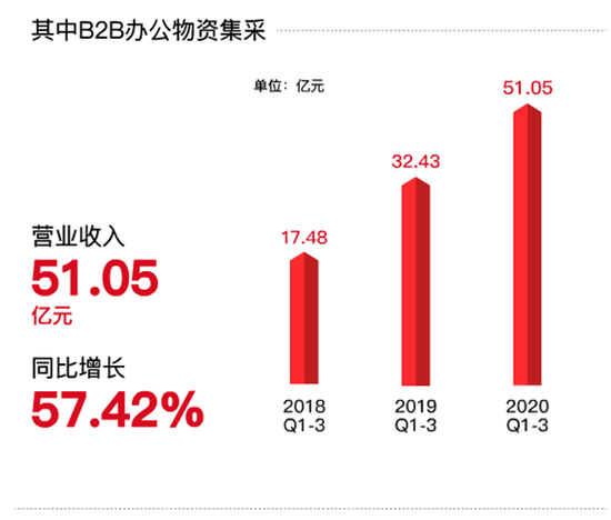 从整体数据来看:公司前三季度营业收入超60亿元,较2019年同期实现了40.14%的增长,其中B2B办公物资集采实现了57.42%的增长;前三季度企业归母净利润2.4亿元,较2019年同期增长30.66%。