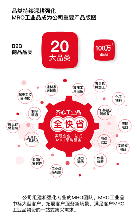 在国家政策大力支持以及工业品互联网不断发展的背景下,工业品市场迎来新的发展机遇。齐心MRO持续强化专业服务团队,以高效、高质、高标准满足客户物资供应要求,分别中标中国海油、国家电投等多个大型企业客户,提供定制化商城平台的API对接以及全国网点劳保用品采购全流程数字化服务,帮助客户实现采购管理工作降本增效,MRO也成为集团营收增长的重要推动力。截至2020年第三季度,B2B商品大品类已达20类,商品数已超100万+。